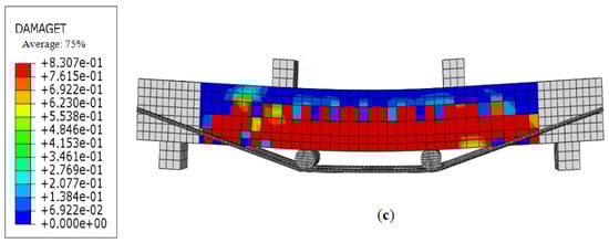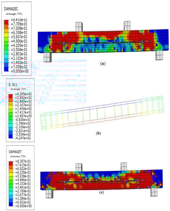 TRB-40-2 numerical simulation diagrams. (a) Stress contour of compressive damage of concrete beam. (b) Stress contour of reinforcement. (c) TRB tensile damage contour.