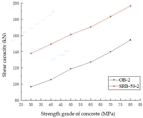 Figure 19 shows the relationships between the shear capacity and the concrete strength grade for beams OB-2 and SRB-50-2. It can be seen that the shear capacity increases with the increasing concrete strength grade. Also, the shear capacities for beam SRB-50-2 always show higher values.