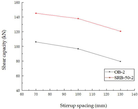 The stirrup spacings of the test beams are 70 mm, 100 mm and 130 mm, respectively, and all the other parameters are consistent. The shear capacities of the OB-2 and SRB-50-2 beams are shown in Figure 20. As is evident in the figure, with an increase in the stirrup spacing, the shear capacities of the beams in the oblique section exhibit downward trends, indicating that a reduction in the stirrup ratio leads to a weakening of the shear capacity. Consequently, it can be concluded that the stirrup spacing exerts a substantial influence on the shear strength of the beam. It is evident that a reduction in the stirrup spacing can shift the failure mode of the test beam from shear failure to ductile failure, thereby enhancing its deformation capability and improving its energy dissipation and ductility performance. However, when considering the construction costs, a balance must be struck between safety and economy in the design process, and the optimal stirrup spacing can be determined based on the specific load and safety requirements.