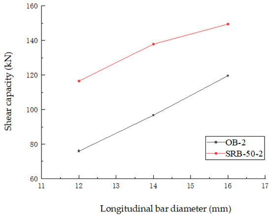 In order to study the effect of longitudinal reinforcement on the shear capacity of external prestressed concrete beams with lateral façades, the other parameters for the OB-2 and SRB-50-2 beams were kept unchanged and only the diameter of the reinforcement was changed in the numerical simulation. In Figure 21, the influence of lower longitudinal bars of beams with different diameters (10 mm, 12 mm and 14 mm) on the shear strength is shown. The results demonstrate that the shear capacity of the beam is directly proportional to the diameter of the longitudinal bar, with larger diameters resulting in higher capacities. This is due to the larger diameter of the longitudinal bar providing greater pin force and limiting the expansion of the oblique crack, thereby increasing the height of the pressure relief zone. Increasing the diameter or number of the longitudinal bars can alter the shear failure mode of the beam, making it more susceptible to ductile failure. It is therefore concluded that by increasing the shear resistance of the beam, the longitudinal reinforcement can control the expansion of the shear crack, thus improving the deformation and warning abilities of the beam before failure.