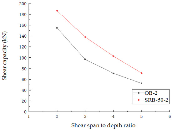 The ratio of shear span to depth is a pivotal factor in determining the shear resistance of concrete beams. In the design and construction of concrete beams, it is imperative to consider the influence of the shear span to depth ratio on the shear resistance, and to implement appropriate reinforcement and optimization measures to ensure the safety and stability of the structure. In this study, the influence of the shear span to depth ratio on the shear capacity was investigated by altering the positions of the OB-2 and SRB-50-2 loads. In Figure 22, the shear capacity of the beam is shown to decrease in proportion to the increase in the shear span to depth ratio. It is evident from the figure that as the shear span to depth ratio rises, the beam’s effective height decreases, resulting in an increased susceptibility to cracking under shearing forces and a reduction in shear resistance. This observation underscores the critical impact of the shear span to depth ratio on the shear capacity of prestressed concrete beams.
