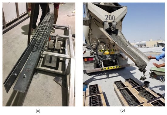The welded wire steel cages were fabricated in the laboratory using a manually operated bending machine specifically designed for this purpose. Throughout the fabrication process, close attention was taken to ensure that both the dimensions of the steel cages and the specified concrete cover adhered to the established tolerances. Precision in these aspects was crucial to maintaining the structural integrity and consistency of the specimens. Experience from the manufacturing process showed that manual fabrication of closed reinforcement steel cages in the laboratory was simple, efficient, and easy. It is expected that with the automation of such a scheme, the process can become more reliable, economical, and suitable for mass production. To achieve uniformity and quality control in the concrete placement, the concreting work was outsourced to a reputable ready-mix concrete supplier. This ensured that the concrete mix met the required specifications, including consistency, strength, and durability, while also minimizing the potential variability associated with manual on-site mixing. Figure 2 shows the steel cage fabrication and casting of specimens.