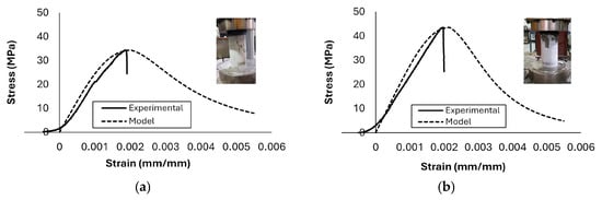 Stress–strain curves for the unconfined concrete cylinder: (a) 34.3 MPa, (b) 43.5 MPa.