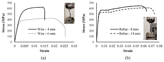 Stress–strain curves for the steel (a) wires and (b) rebars.