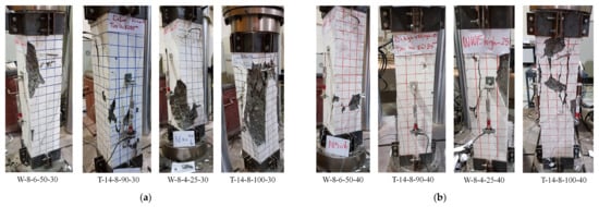 Distressed specimens during the tests. (a) Group 1, (b) Group 2.