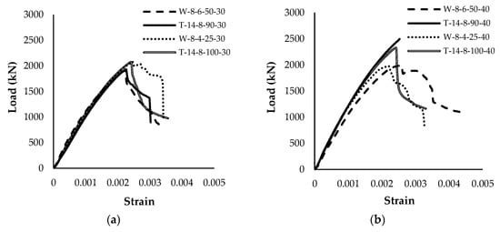 Load–strain curves for all tested columns. (a) Group 1, (b) Group 2.