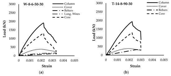 The experimental tests focused on recording the applied load, column deformation, and LVDT readings, providing a comprehensive dataset for analysis. These data were processed to generate load–strain curves for each column, which were subsequently used to study key structural properties, including ultimate strength and core confinement. These plots formed the basis of comparisons between the behavior of WWR reinforced columns and their counterparts reinforced with conventional ties. Theoretical prediction by the ACI 318-25 [] code equation for tied columns was utilized to forecast the ultimate strength of the columns. Figure 9 shows the load–strain curves of the entire cross-section (referred to as a column in the figures), plus the individual load–strain diagrams of the material constituents (concrete cover, longitudinal steel rebars and wires—if present—and concrete core) for the four samples in Group 1. The corresponding load–strain curves for Group 2 are presented in Figure 10.