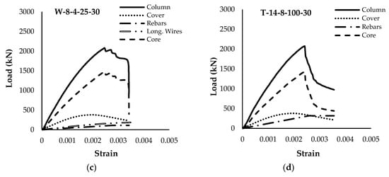Detailed load–strain curves for columns in Group 1. (a) W-8-6-50-30, (b) T-14-8-90-30, (c) W-8-4-25-30, and (d) T-14-8-100-30.