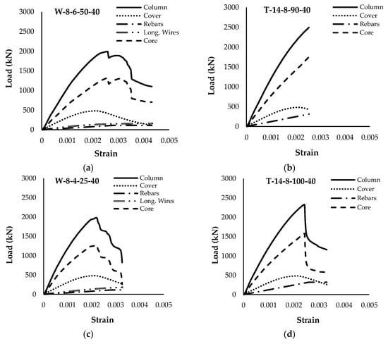 Detailed load–strain curves for columns in Group 2. (a) W-8-6-50-40, (b) T-14-8-90-40, (c) W-8-4-25-40, and (d) T-14-8-100-40.