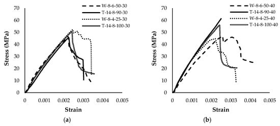 In contrast, in Group 2 (higher-strength concrete), the tie-reinforced columns outperformed their WWR-confined counterparts. The tie-reinforced specimen T-14-8-90-40 reached a maximum core stress of 62.0 MPa, notably exceeding the 46.7 MPa observed for W-8-6-50-40. A similar trend was observed for T-14-8-100-40, reaching 55.9 MPa, compared to the 44.8 MPa attained by W-8-4-25-40. On average, the tie-confined columns within Group 2 showed a 28.8% higher core strength than their WWR-reinforced counterparts. These results indicate that, in higher-strength concrete, larger-diameter ties provide a more robust confining pressure than the tested WWR configurations. Note that the T-14-8-90-40 column did not exhibit failure during testing, as the Universal Testing Machine (UTM) reached its maximum load capacity before the column achieved its ultimate strength. This behavior is evident in the corresponding stress–strain curve, which lacks a distinct peak for T-14-8-90-40, indicating that the ultimate strength was not fully captured.