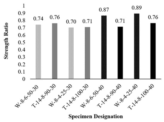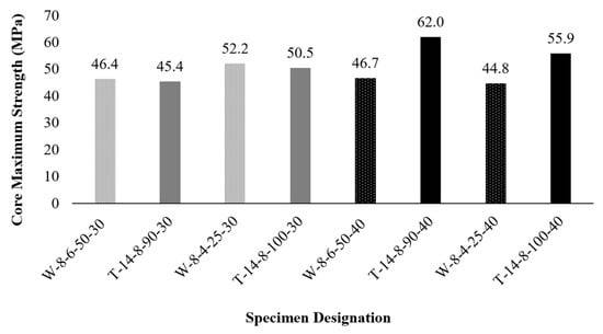 The effect of concrete compressive strength on the confinement effectiveness of the tested columns was evaluated by comparing the performance of columns in Group 1 with their corresponding counterparts in Group 2, as shown in Figure 12. As anticipated, the results showed that an increase in concrete compressive strength consistently led to a higher maximum core strength. Across all the tested columns, the increase in maximum core strength between the two strength levels was moderate, averaging 7.7%. A notable deviation from this trend was observed in column W-8-4-25-30 and its counterpart W-8-4-25-40, where the column with a lower compressive strength exhibited a higher maximum core strength. The overall difference between the effect of the two strength levels on the confinement of the columns remains relatively small, as the gap between their compressive strengths is not substantial.