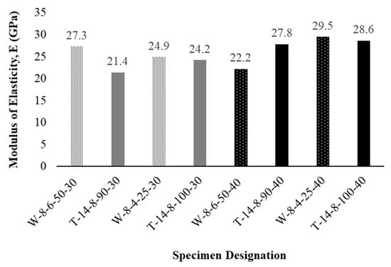 Based on this definition, the calculated modulus of elasticity values for all the tested columns range from 21.4 GPa to 29.5 GPa. Columns reinforced with WWR showed, on average, a slightly higher modulus of elasticity of 26.0 GPa compared to 25.5 GPa for columns reinforced with conventional ties, indicating that WWR reinforced columns demonstrated a 2.0% increase in their modulus of elasticity. This modest improvement is primarily attributed to the continuous confinement provided by the WWR cage, which mitigates early lateral expansion and delays cracking at lower stress levels. Among the tested columns, the highest modulus of elasticity of 29.5 GPa was observed in specimen W-8-4-25-40, underscoring the positive influence of closer wire spacing and a higher concrete strength level. In contrast, column T-14-8-90-30 exhibited the lowest modulus of elasticity of 21.4 GPa, reflecting the reduced confinement effectiveness of tie reinforcement, which can foster earlier cracking at moderate stress levels. Overall, the observed modulus of elasticity trends indicates that WWR slightly enhances the elastic performance of concrete columns, while offering practical benefits in construction efficiency. Figure 14 shows the modulus of elasticity values for all the tested columns.