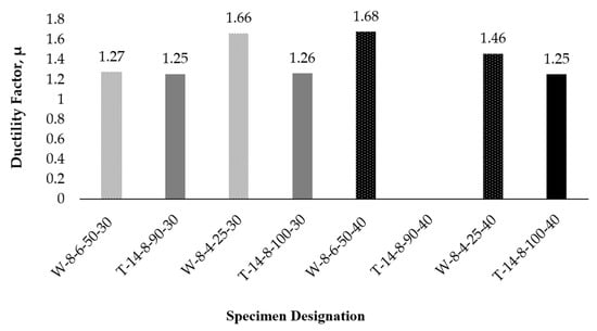 The ductility factors determined from experimental results clearly demonstrate that all columns reinforced with WWR exhibited a consistently higher ductility compared to columns reinforced with ties. WWR columns exhibited, on average, a higher ductility factor of 1.52, compared to 1.25 for columns reinforced with conventional ties. This indicates that WW reinforced columns demonstrated, on average, a 21.0% increase in ductility over tie reinforced columns. This enhancement is attributed to the continuous lateral confinement provided by WWR, which delays the onset of local failures and promotes a more gradual post-peak response. In contrast, tie reinforced columns showed relatively uniform ductility values between 1.25 and 1.27, indicating a stable, though moderate, enhancement in deformation capacity. It is worth noting that the ductility factor for column T-14-8-90-40 could not be determined because this column did not experience complete failure during testing; consequently, the descending portion of its stress–strain curve was unavailable.