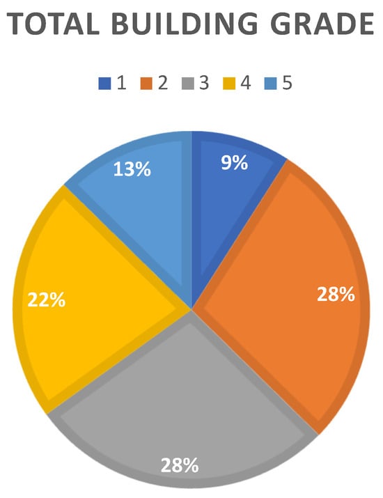 Using the provided condition scale, the total building condition was calculated as a geometric mean of the conditioned categories obtained for each component. It is essential to clarify that condition category 1, which includes a remaining lifetime of less than 0%, concerns the components that have exceeded their sustainable use life.