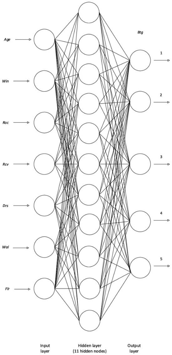 A multilayer perceptron (MLP), a type of ANN, was employed to construct the model. MLPs consist of multiple layers of interconnected nodes, typically including an input layer, one or more hidden layers, and an output layer. Each node within a layer is connected to every node in the adjacent layer, enabling the model to learn complex relationships by adjusting the weights between the nodes through training. This architecture allows MLPs to capture non-linear patterns in data, making them particularly effective for tasks like forecasting and classification []. Due to the nature of the output variables, a classification ANN algorithm was used. Figure 2 shows the architecture of the optimal selected ANN model.