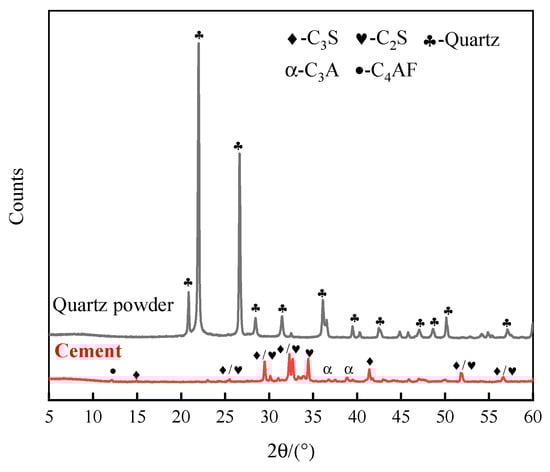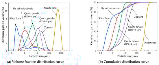 For this study, the main raw materials used in the experiments included cement, SF, FAMs, quartz powder, steel fibers, a water-reducing agent, and water. Among these materials, two particle sizes of quartz powder were utilized. The cement used was PI 52.5 Portland cement, with a measured specific surface area of 378 m2/kg. The compressive strengths at 3 d and 28 d were 31.8 MPa and 58.6 MPa, respectively. The chemical compositions, as presented in Table 1, were obtained through X-ray fluorescence (XRF) analysis, and represent the mass percentage of major oxide components in each material. The mineral compositions of the cement were as shown in Figure 1, with a median diameter (D50) of 15 μm; the particle size distribution is detailed in Figure 2. The chemical composition and particle size distribution of the SF can be found in Table 1 and Figure 2, with a SiO2 content of 91.9% and a D50 particle size of 0.5 μm. The primary mineral composition of the quartz powder was predominantly SiO2, as shown in Figure 1. The particle size distributions of the two types of quartz powder are detailed in Figure 2, with D50 particle sizes of 4 μm and 8 μm, smaller than that of the cement. The chemical composition is detailed in Table 1, primarily consisting of SiO2 and Al2O3, with an amorphous structure. The particle size distribution is shown in Figure 2, with a D50 particle size of 1.5 μm, approximately 1/13 of the median diameter of ordinary fly ash. Microspheres with particle sizes of between 0.5 and 2 μm accounted for 65%, while those larger than 10 μm made up 15% of the distribution.