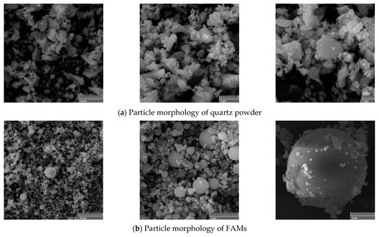 The particle morphology of the quartz powder used in this study is shown in Figure 3a. It can be observed that the particles of quartz powder have an irregular shape, are uneven in size, and possess a relatively smooth and dense surface. The particle morphology of the FAMs is presented in Figure 3b, which illustrates that the microspheres have a smooth, glass-like appearance. This morphology is beneficial for the “rolling” treatment of the paste, greatly enhancing the flowability of UHPC. The particle size distribution of the quartz powder ranges from 40 to 80 mesh; further details are provided in Figure 2. The steel fibers used in the experiments have a length of 13 mm, a diameter of 0.2 mm, and a tensile strength of ≥2850 MPa. The water-reducing agent employed in the experiments was a polycarboxylic acid-based high-performance water reducer, with a water reduction rate of ≥35%.