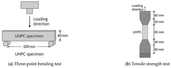 The flowability of the UHPC was tested according to the procedure described in the Chinese standard GB/T 2419-2005 (method for testing the fluidity of cement mortar) []. When testing the flowability of UHPC, the mixed UHPC was first placed into a slump cone. After lifting the cone, measurements were taken when the UHPC no longer spread or when the spreading time reached 50 s. A steel ruler was used to measure the maximum diameter of the spread surface of the UHPC mixture and the diameter in the direction perpendicular to the maximum diameter. The arithmetic mean of these two measurements was then calculated to determine the result of the flowability test.