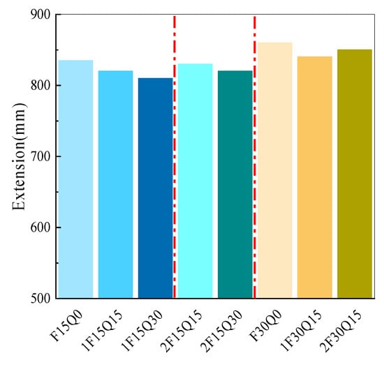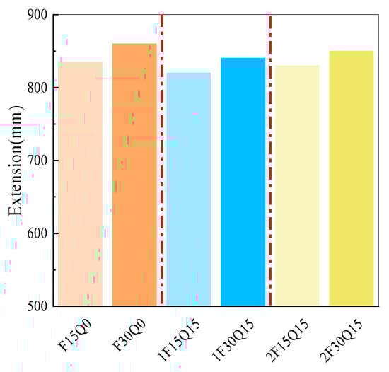 The effect of different quartz powder contents on the flowability of UHPC is illustrated in Figure 6. It can be observed that with the same FAM content, as the quartz powder content increases, the flowability decreases. For instance, the flowability of 1F30Q15 and 2F30Q15 is reduced by 20 mm and 10 mm, respectively, compared to F30Q15. This is primarily attributable to the increased specific surface area associated with higher quartz powder dosage, which leads to higher water demand and greater internal friction. Moreover, the cement and quartz powder have similar zeta potentials and chemical properties, which result in comparable electrostatic repulsion between the cement–quartz powder particles and between the cement particles themselves []. Furthermore, it is evident that the finer quartz powder (4 μm) results in lower flowability than the coarser powder (8 μm) at the same replacement rate. The finer particles possess greater surface energy and absorb more free water, thereby reducing the effective water available for lubrication between particles [,].