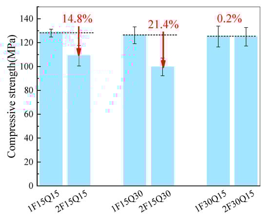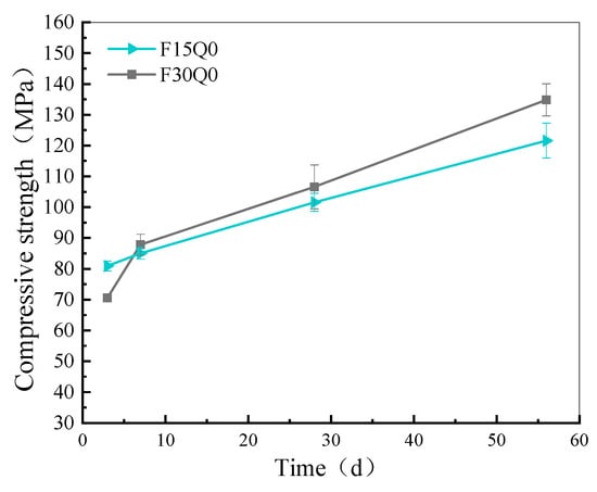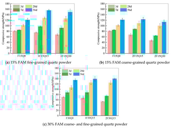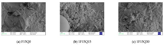 The compressive strength of UHPC samples with different quartz powder contents is illustrated in Figure 7. As shown in the figure, in UHPC samples with the same quartz powder content, the compressive strength increases with the curing age, indicating that the incorporation of quartz powder does not hinder the hydration of cement. At the same age, the compressive strength of the UHPC varies with the content and fineness of quartz powder. At a curing age of 3 d, as the quartz powder content increases, the strength of UHPC gradually decreases. This is mainly due to the reduction in hydration products with the increase in quartz powder content, leading to the lower early strength performance of the concrete. When the FAM content is 15%, after 7 d of curing, the compressive strength of UHPC with fine particle size quartz powder is greater than that of UHPC without quartz powder. However, as the quartz powder content increases, the compressive strength of the UHPC initially rises and then declines, as depicted in Figure 7a. At a curing age of 56 d, for UHPC samples with a FAM content of 15% and quartz powder contents of 0%, 15%, and 30%, the compressive strengths are 121.5 MPa, 155.5 MPa, and 149.4 MPa, respectively. After 7 d of curing, the strength of UHPC incorporating 15% coarse particle size quartz powder is greater than the strength of UHPC without quartz powder, whereas the compressive strength of UHPC with 30% coarse particle size quartz powder is lower than that of UHPC without quartz powder, as shown in Figure 7b. The initial increase in compressive strength is primarily attributable to the filler effect of quartz powder, which improves particle packing density and refines the pore structure, thereby enhancing the compressive strength [,]. However, excessive quartz powder content dilutes the cement content, leading to a reduction in the amount of hydration products such as C-S-H gel. This dilution effect results in a weakened microstructure and, ultimately, a decrease in strength []. After 56 days of curing, the compressive strengths of 2F15Q15 and 2F15Q30 are 1.5% higher and 6.4% lower, respectively, compared to the compressive strength of F15Q0. When the FAM content is 30%, after 3 d of curing, the compressive strengths of 1F30Q15 and 2F30Q15 are 4.5% and 24.0% lower, respectively, than that of F30Q15, as shown in Figure 7c. After 28 d and 56 d of curing, the compressive strengths of UHPC incorporating 15% of both coarse and fine particle sizes of quartz powder are greater than that of UHPC without quartz powder.