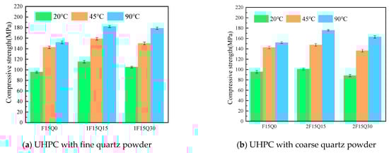 Figure 10 illustrates the effect of curing temperature on the compressive strength of UHPC with quartz powder. As shown in the figure, as the curing temperature increases, the compressive strength of quartz-powder UHPC continuously rises. The compressive strength of quartz powder UHPC at a curing temperature of 45 °C shows a significant improvement compared to that at 20 °C. At a curing temperature of 90 °C, the 7-day compressive strength of quartz powder UHPC ranges from 152.0 MPa to 182.1 MPa. This improvement is primarily due to the acceleration of cement hydration kinetics at higher temperatures, which promotes the early formation of C-S-H gel. Additionally, steam curing at 90 °C stimulates the pozzolanic activity of fine quartz powder, which indicates further C-S-H formation and the consumption of CH. This contributes to microstructural densification, thereby enhancing mechanical performance. As demonstrated by Bolina et al. [], the thermal behavior of UHPC is closely linked to its composition, further underscoring the significance of microstructure tuning through fine particle additives such as quartz powder. As the quartz powder content increases, the compressive strength of quartz powder UHPC initially rises and then declines, peaking at a quartz powder content of 15%. Thus, it can be observed that a quartz powder content of approximately 15% is optimal, with the compressive strength of UHPC containing 15% fine particle size quartz powder being 182.1 MPa. Comparing Figure 10a and Figure 10b, it is evident that when the quartz powder content is 15%, the compressive strength of the mixture with a fine particle size is improved by 3.6% to 14.4%, compared to the mixture with a coarse particle size. At a quartz powder content of 30%, the compressive strength of the fine particle size mixture is enhanced by 9.7% to 19.3% over that of the coarse particle size mixture. This indicates that a finer particle size of quartz powder has a better pore-filling effect in UHPC, effectively improving its compressive strength.