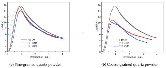 As shown in Figure 11a,b, with increasing quartz powder content, both the flexural strength and deflection of quartz powder UHPC decrease, which is related to the primary component of quartz powder being SiO2. A comparison of Figure 11a and Figure 11b reveals that the flexural strength of the UHPC with fine quartz powder is higher than that of the UHPC with coarse quartz powder in terms of both flexural strength and deflection. The incorporation of coarse quartz powder significantly reduces the flexural strength and deflection of UHPC, suggesting that fine quartz powder provides a better filling effect in the pores of UHPC than coarse quartz powder. The flexural strength of UHPC with 15% fine quartz powder is close to that of UHPC without quartz powder. Although the addition of quartz powder can reduce flexural strength, with the inclusion of fine rather than coarse quartz powder, UHPC can still maintain relatively high flexural strength and deflection.