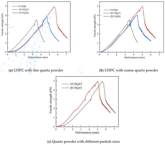 Figure 12 shows the tensile strength of UHPC samples with different fineness gauges and contents of quartz powder. The tensile strength of quartz powder UHPC samples ranges from 8.9 MPa to 12.7 MPa, and the tensile strength of UHPC with 15% quartz powder is 42.7% higher compared to that of UHPC without quartz powder. This indicates that the incorporation of quartz powder significantly enhances the tensile strength of UHPC. From the figure, it can be observed that as the quartz powder content increases, the tensile strength of quartz powder UHPC initially increases and then decreases. The tensile strength of UHPC with added quartz powder remains higher than that of UHPC without quartz powder. This can be attributed to the effective pore-filling of UHPC by the appropriate amount of quartz powder, which improves its tensile strength. Figure 12c shows that the fine quartz powder exhibits higher tensile strength, indicating that fine quartz powder fills the pores of UHPC more effectively than coarse quartz powder, which is consistent with previous findings on compressive strength.