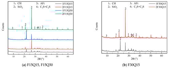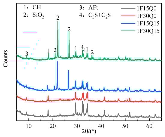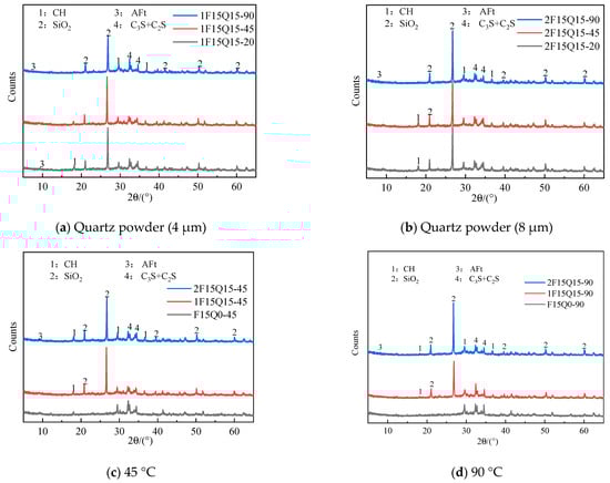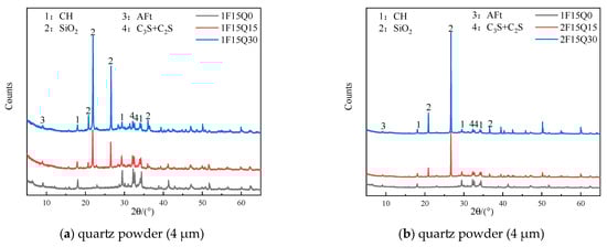 Figure 14 presents the XRD patterns of paste samples containing different fineness of quartz powder and the same amount of FAMs after 28 d. From Figure 14a,b, it can be seen that in the paste samples F15Q15, F15Q30, and F30Q15, the only variable is the fineness of the quartz powder, while the types of hydration products are consistent. The contents of AFt and CH are also fairly similar. However, in the paste containing the fine particle size of quartz powder, the content of SiO2 is lower, and the SiO2 peak at 2θ = 21.99° is more pronounced in the fine particle size paste.