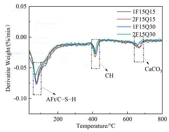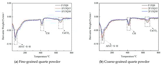 Figure 17 shows the DTG patterns of pastes of different fineness and with varying dosages of quartz powder after 28 d of curing. From Figure 17a,b, it can be observed that the DTG curves exhibit three mass loss peaks. The mass loss between 50 °C and 200 °C is primarily due to the decomposition of hydration products such as AFt and the loss of bound water in C-S-H gel. The mass loss occurring between 400 °C and 500 °C is related to the decomposition of CH. Additionally, the mass loss between 600 °C and 700 °C is attributable to the thermal decomposition of CaCO3 formed by the carbonation of CH [,,]. After 28 d of hydration, with an increased dosage of quartz powder, the contents of AFt/C-S-H and CH decrease correspondingly, which is consistent with the observations from the XRD patterns. Figure 18 shows the DTG curves of paste samples with different fineness grades of quartz powder. From the figure, it can be observed that UHPC with finer quartz powder content exhibits greater mass loss at 50–200 °C (indicative of AFt/C-S-H content) compared to that with coarser quartz powder. This is due to the fact that finer quartz powder provides a greater surface area, acting as nucleation sites for C-S-H gel formation and accelerating early hydration.