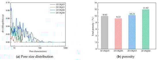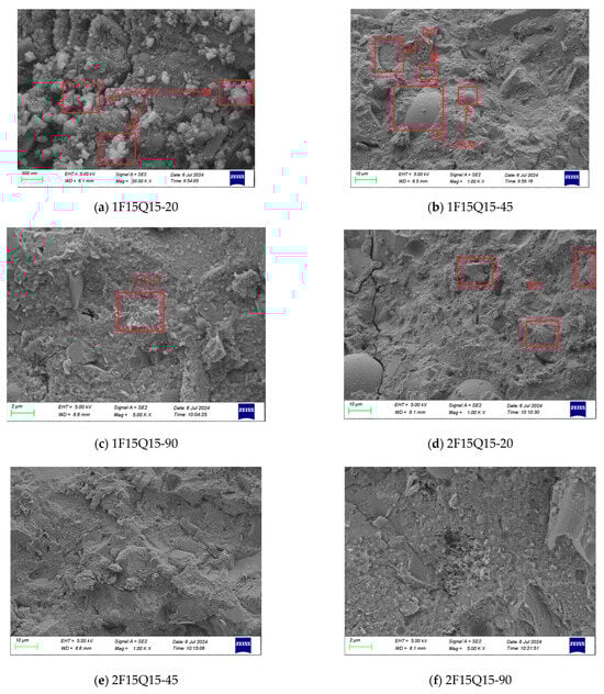 Figure 19a,b illustrates the pore size distribution and porosity of paste specimens with different fineness and dosages of quartz powder, along with a constant dosage of FAMs after 28 d of curing. From Figure 19b, it can be seen that the porosities of the 1F15Q15, 1F15Q30, 2F15Q15, and 2F15Q30 mixtures are 9.93%, 9.22%, 10.21%, and 11.92%, respectively. These results indicate that fine quartz powder provides a superior filling effect, enhancing the pore structure of the slurry. However, as the dosage of quartz powder increases, the paste with fine quartz becomes denser, while the coarser quartz powder adversely affects the stability of the paste. Additionally, it is noticeable that those pores smaller than 10 nm in the fine quartz powder samples of UHPC are significantly reduced compared to those with coarse quartz powder. The incorporation of fine quartz powder refines the internal micropores of the UHPC and effectively fills those pores smaller than 10 nm, improving packing density. When analyzed in conjunction with Figure 19a, the 2F15Q30 paste exhibits significantly more numerous large pores compared to the 2F15Q15 paste. Under loading conditions, these large pores are more likely to become initiation points for cracking in the paste, leading to a reduction in concrete strength, which is consistent with the observed macroscopic mechanical performance.