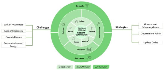 Figure 3, the loops are shown in the key at the bottom, with the lightest green indicating the short loop, the darker green the medium loop, and the darkest green the long loop. The left-hand side highlights the challenges associated with implementing the 10Rs, whereas the right-hand side highlights the strategies suggested by the expert interviews and document review to combat these barriers. This study highlights the critical challenges, including insufficient awareness, limited resources, financial barriers, and customised design, in implementing circular economy practices in modular construction. To address these challenges, this research identified strategies such as the development of policies, incentives, and standards.