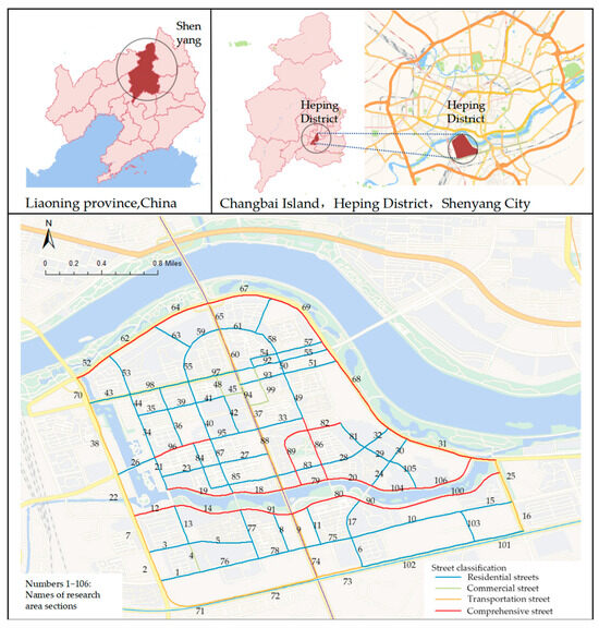 The study site is Changbai Island in Heping District, Shenyang City, which is an integrated residential cluster (Figure 1). The area’s residential, transportation, natural resources, educational resources, and commercial amenities have developed from 2008 to the present. Changbai Island is divided into an inner island and an outer island. The inner island covers an area of about 5 square kilometers, and the outer island is about 5.87 square kilometers. The inner and outer islands are separated by a circular water system of about 10 km in length. Forty-seven settlements have been built in the study area, with most completed between 2010 and 2019. These settlements are densely packed and feature a variety of architectural forms. At the same time, several large-scale comprehensive parks and recreational green squares have been constructed on the outer side of Changbai Island. Malls and several schools have also been built on the island. Overall, the Changbai Island area is a typical comprehensive residential area. This area demonstrates the diversity of physical characteristics of built space during urban expansion.