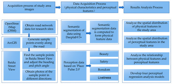 Scholars have been scoring scenes in Chicago-area pictures based on visual attributes like safety, beauty, and landscape preference since 1967. Data on safety, beauty, and preference were used to analyze public perception studies of the visual appearance of neighborhoods. Building on this foundation, scholars have explored human perception and psychological well-being by examining factors such as socio-economic determinants, social dynamics, the physical environment [37], infrastructure configurations [38], and tourism-related attributes [39]. Humans’ psychological perception of urban scenes stems from their perceptions [40] and satisfaction [41] after experiencing the place. It influences humans’ emotions and, through perception, affects their willingness to engage in physical activities [42,43]. Human psychological perception after place experience mainly covers positive perceptions such as beauty and safety and negative perceptions such as boredom, insecurity, and depression [44,45,46].