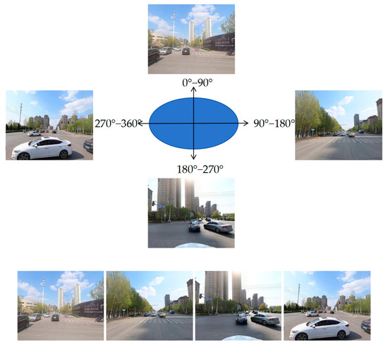 Streetscape imagery is a method for obtaining data on the appearance of cities [95]. This method has been widely used to study the objective attributes of streets and subjective human perceptions [96]. Baidu Maps (https://map.baidu.com/ (accessed on 25 February 2023)) is the largest online map provider in China. Baidu Maps provides panoramic images similar to Google Street View (GSV) [67]. Baidu Street View images were captured by a team of collectors from 10 am to 4 pm on weekdays. To explore the relationship between visual perception and physical characteristics of streets, this study used OpenStreetMap (OSM) to obtain the road network data of the study area. The road network data were used to create road maps, which were then transferred into ArcGIS to simplify the network into single-lane streets [97]. ArcGIS10.2 software was used to delineate sampling points at 50-m intervals, creating a total of 955 sample points. To ensure that the street photos reflected the visual characteristics of pedestrians, the parameters of the street images were configured before capturing the images. Parameters were captured by presetting the street images to ensure the equivalence between the simulated visual field and the actual perception of pedestrians [98]. The heading angles were respectively set to 0, 90, 180, and 270 (Figure 3). Baidu Street View (BSV) images were then manually captured for all sample points in four horizontal directions.