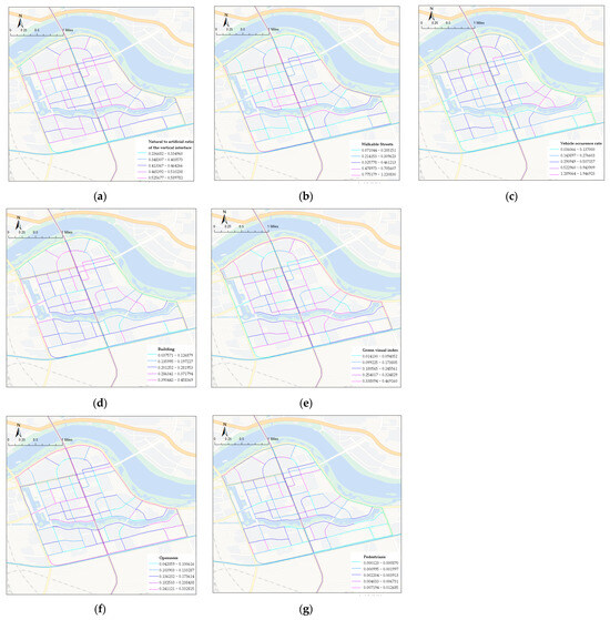 Spatial distribution maps of physical characteristics: (a) natural to artificial ratio of the vertical interface; (b) walkable streets; (c) vehicle occurrence rate; (d) building enclosure; (e) green visual index; (f) openness; (g) pedestrians. (Clear diagrams have been placed in Appendix A).