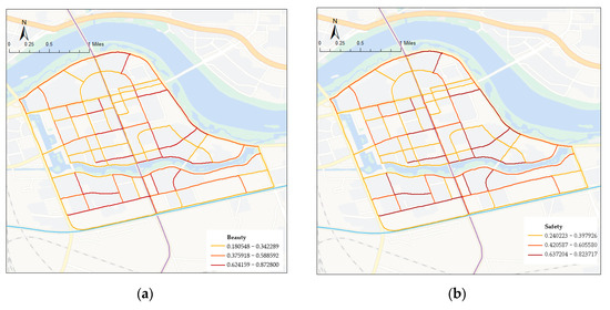 We assigned the spatial perceptual prediction data to each street segment and calculated the average perceptual eigenvalue for each segment. The results of the four perceptions of beauty, safety, boredom, and liveliness were visualized, and significant spatial heterogeneity in the perceptions of the study area was found (Figure 6). Overall, beauty and safety showed similar patterns in spatial distribution, while boredom and liveliness showed significantly different spatial distributions.
