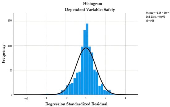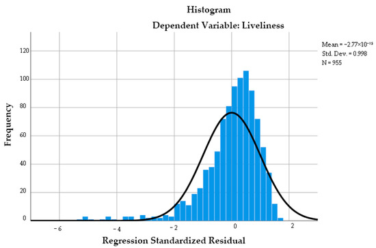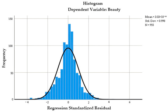 To model the relationship between beauty perception and physical street characteristics, we performed a stepwise regression analysis with beauty perception as the dependent variable and the four retained physical characteristics as independent variables (Figure 7). The standardized regression residuals exhibited a near-normal distribution, confirming that the data satisfied the model’s normality assumption.