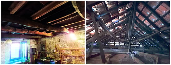 Historically, timber has been one of the most important materials in traditional Portuguese construction, showing versatility and sustainability [,,,]. At the structural level, timber has been widely used in various building components due to its availability, mechanical properties, and adaptability. The left image in Figure 1 shows timber pavement with the traditional construction practice using wooden beams to support flooring systems. These beams provide structural integrity while offering flexibility under loads. The layout often consists of a series of longitudinal beams carried on either walls or secondary timber elements. This geometry reflects the efficient use of materials and ease of assembly, typical of vernacular Portuguese architecture. The right image in Figure 1 presents a particular timber roof structure representative of the traditional construction type. The truss-like structure in the primary load-carrying frame of the roof is made from timber rafters. The sloping configuration provides good drainage for rainwater, while the application of the terracotta tiles acts to insulate and provide weather protection. This is indeed a very exemplary system with a successful combination of timber and local materials that contributes to both functionality and aesthetic appeal. The visible geometry of the roof indicates careful consideration of load distribution and resistance to wind forces, showing the ingenuity of traditional design solutions.