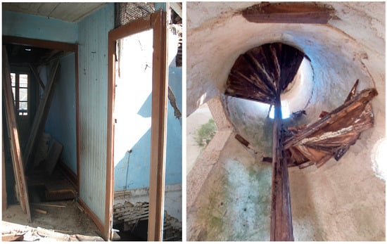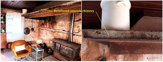 After the above-mentioned period, cement became more available in Portugal. Therefore, cement-based mortar and concrete started to be used more often with timber. For instance, the partition wall in the left image of Figure 4 exemplifies this building technology solution. The vertical timber boards and the cement-based mortar applied on both sides of the wall are visible. Considering the compressive strength of the cement-based mortar, we are dealing with a mixture of structural building elements. As seen in the right image of Figure 4, a timber pavement was reinforced with a layer of cement-based concrete. This reinforcement was local and aimed to increase the pavement’s resistance in this area because it is related to a kitchen floor (the case study in Figure 4 [right]). An enormous granite stone had to be placed to work as a fireplace. Additionally, the cement-based concrete layer also aimed to increase fire resistance and improve the waterproof behaviour of the pavement. It is important to note that the cement-based concrete layer had been reinforced with timber elements, as shown in the right image of Figure 4. Additionally, an example of a traditional Portuguese timber-reinforced concrete chimney is shown in Figure 5 (left and right). In both cases, it is noted that the construction materials (e.g., timber and concrete) are very well preserved. No pathologies can be observed because the concrete preserves timber elements. The timber preservation is needed to improve the durability of wood and avoid damage from environmental/biological attacks for better sustainability in different applications. A major reason for preserving timber is to prevent biological deterioration caused by fungi, insects such as termites and wood borers, bacteria, and marine borers, all of which can weaken or degrade timber structures. Timber preservation also increases the longevity of the timber, reducing replacement cycles and extending the service life of structures like bridges, poles, and buildings. Additionally, timber is vulnerable to moisture and weathering, which can cause warping, cracking, and decay; applying preservatives helps to maintain dimensional stability and prevent these issues. Some treatments also enhance timber’s fire resistance, which makes timber safer to use in construction work.