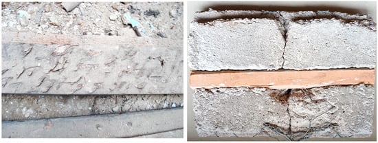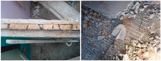 These techniques provide not only improvements in structural safety but also manifest the ingenuity of traditional craftsmanship in solving problems related to the compatibility and durability of materials []. One of the approaches includes using irregularly cut timber pieces that provide a mechanical interlock with concrete, increasing the area of contact and thus improving the bond between the materials. Smearing moisturiser on timber surfaces before embedding them in concrete improves adhesion by allowing concrete to penetrate through the porous structure of wood []. Other methods that have been very effective are those where the rugosity of timber elements (Figure 16, left) provides a textured interface to give a good bond to the concrete. The addition of a steel net to the covering layer of concrete, as shown in the right image of Figure 16, reinforces this system considerably. With this approach, stress sharing becomes highly uniform, localised failure is reduced, and seismic advantages due to this technique may prevent the collapse of the structural members during earthquakes []. This technique, when combined with vertical timber elements nailed to the timber pavement, enhances anti-seismic behaviour due to the addition of flexibility and energy dissipation capabilities []. These traditional solutions underpin the need for material compatibility and innovative design in creating strong and resilient structures, thus serving as a useful inspiration for modern engineering practices, especially in seismic areas. By learning and combining these ancient technologies, today’s architects and engineers can develop hybrid timber–concrete systems that integrate traditional knowledge with modern technology for stronger and more sustainable construction.