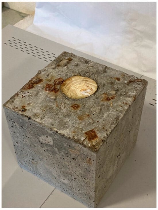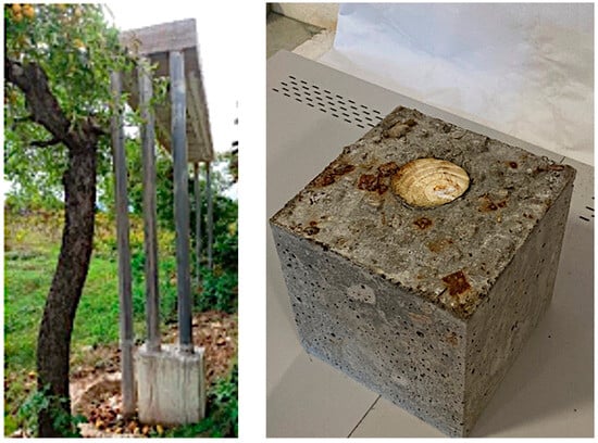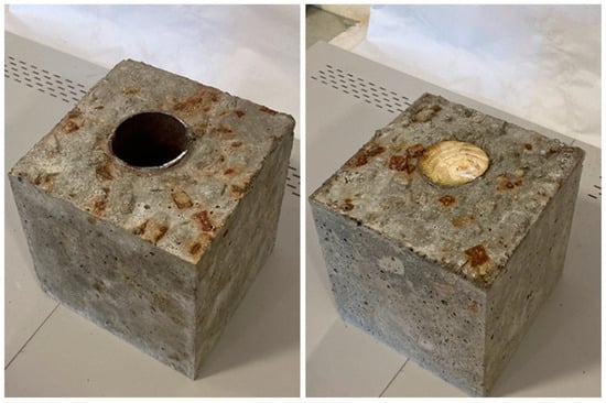 In the preliminary phase of the current study, the aim was also to understand the ability of concrete based on wood waste to adhere to metallic and wooden elements. To this end, a circular tubular steel profile (Figure 13, left) and a circular wooden element (Figure 13, right) were used. The two structural elements did not undergo any type of treatment. After concreting and drying, it was observed that in the case of the metal tube, there was good adhesion between the two materials (Figure 13, left). In contrast, in the case of the wooden element, there does not seem to have been good adhesion between the materials. In fact, a joint emerged between the wood waste-based concrete and the wood element (Figure 13, right). In the latter case, perhaps pre-wetting the wooden element or ensuring some surface roughness will allow adhesion between materials. With these quick tests, it was also realised that it is possible to create a covering layer with concrete based on wood waste.