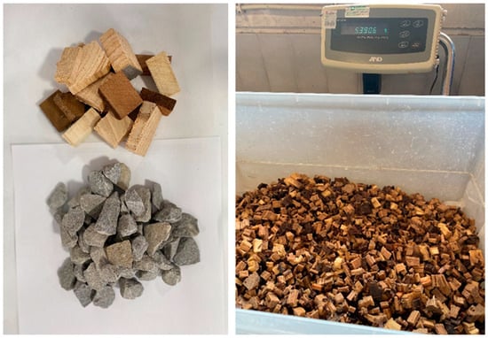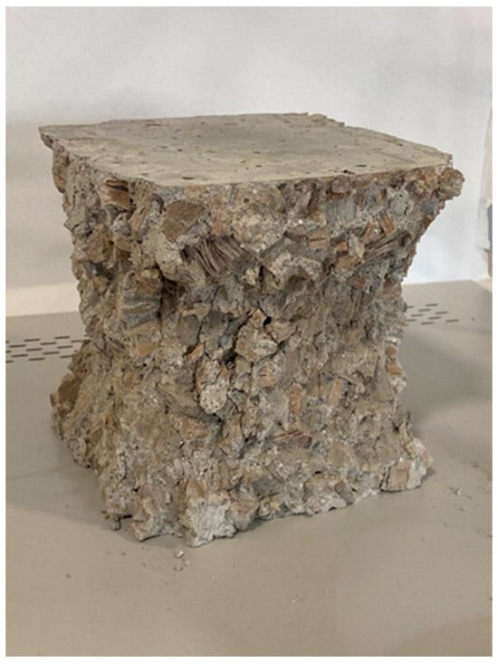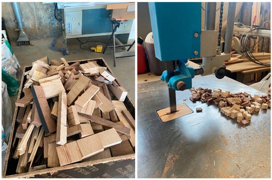 As can be seen in the left image of Figure 9, this type of waste has dimensions much larger than those of concrete aggregates; as such, it was necessary to adapt it. For this purpose, an existing cutting machine for carpentry was used (Figure 8, right). However, after this procedure, the pieces of wood were still larger than normal gravel (Figure 9, left). To correct this, a jackhammer was used, and the wood waste aggregate began to present a more appropriate particle size, as shown in the right image of Figure 8.