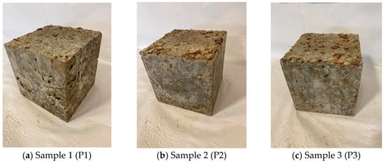 Figure 11 shows the drying behaviours of three specimens, P1, P2, and P3, as their weight decreases with time, indicating water evaporation through the curing process, a common trend for concrete material as water dries out with hydration and exposure to the atmosphere. Such drying has a considerable influence on the mechanical behaviour of the concrete, especially in terms of compressive strength, as excessive water evaporation may result in internal stress and possible cracking. At 28 days, the specimens were tested for compressive strength, with the results detailed in Table 1, revealing an average compressive strength of 4 MPa. This is below the minimum threshold of 8 MPa for lightweight concrete as specified by NP EN 206-1:2007. This underperformance therefore raises concerns about the suitability of the current concrete mix design, especially with the incorporation of wood waste aggregates, which usually present higher water absorption and lower stiffness than conventional aggregates, leading to a reduction in compressive strength. The results for individual specimens show variability in mechanical performance: P1 exhibited the lowest failure stress at 3.5 MPa, P2 the highest at 4.4 MPa, and P3 slightly lower at 4.2 MPa. These differences may stem from variations in specimen density or non-uniformity in mixing and curing. Despite these differences, all specimens failed in a “normal” and predictable way, as predicted for concrete under compressive loading, which is further confirmed by Figure 12, which shows the failure patterns. Hence, this lower compressive strength would mean the inclusion of finer or treated wood wastes along with pozzolanic additives, such as silica fume, that will increase the bond strength through the optimisation of the water-to-binder ratio. Also, this workability, coupled with porosity, can be further enhanced through the use of chemical admixtures like superplasticisers. This extreme drying may be counteracted by different curing alternatives, including water curing and sealed curing that allow for better hydration, which may then aid in achieving a higher compressive strength. The obtained compressive strength of 4 MPa is lower than the minimum requirements set for lightweight concrete in NP EN 206-1:2007, with a minimum value of 8 MPa. This result needs further investigation regarding other mix designs or further modification of the present mix, particularly with regard to wood waste aggregates, to attain better mechanical properties of the concrete. Long-term mechanical and durability tests, such as tensile strength and freeze-thaw resistance, along with microstructural examination by SEM, are recommended to assess the feasibility of this material for practical applications.