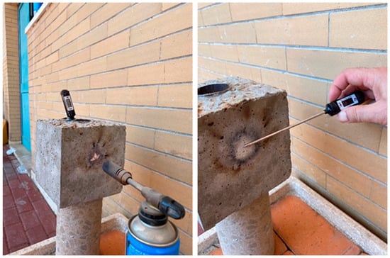 The research was also supposed to investigate the fire-resistant capacity of the studied concrete and its efficiency in case of fire for the protection of the structural elements. For that purpose, a quick-fire resistance test was conducted on the specimen concrete, as depicted in Figure 14 (right). Heating one side of the specimen with a controlled heat source—a torch—for 10 min, as shown in Figure 14 (left), enables the execution of the test. For the entire duration of the test, no evidence of combustion was recorded on the wood-waste-based concrete specimen. This was evident enough that the material did not show any visible damage, and there was no evidence of smoke formation or the release of toxic gases. These results show that the concrete, even with the addition of wood waste granulate, has a high resistance to fire. The layer of concrete with wood residue also appeared to provide good thermal insulation for the steel pipe embedded in it. The temperature readings followed the trend below. Before the test, the steel pipe had an initial temperature of 26 °C. After 3 min of exposure, the temperature remained constant. A gradual rise in temperature was realised after only 6 min of testing. At the end of the 10-min test, the inner surface of the steel pipe reached a temperature of 42 °C. However, the temperature on the surface of the specimen facing the torch flame reached as high as 153 °C, as reflected in Figure 14 (right). These results indicate that the concrete made from wood waste is not only fire-resistant intrinsically, but also acts as an effective insulation barrier to minimise heat transfer through it to the underlying structural elements like steel. This makes it a prospective material for fire-resistant construction.