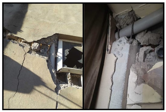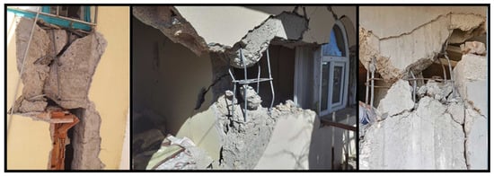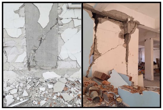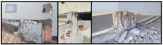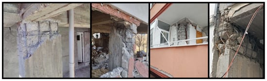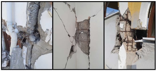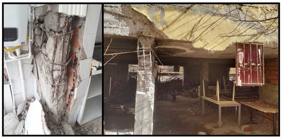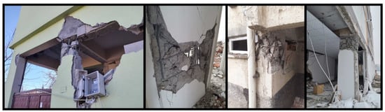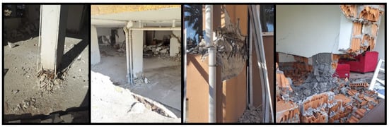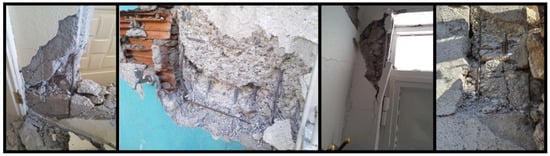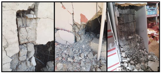 The low strength of the concrete used in reinforced concrete columns has led to varying levels of structural damage. This low concrete strength is generally due to factors such as the use of non-graded aggregates, insufficient dosage, inadequate mixing, lack of compaction, and insufficient curing. Examples of damage caused by low-strength concrete are shown in Figure 3.