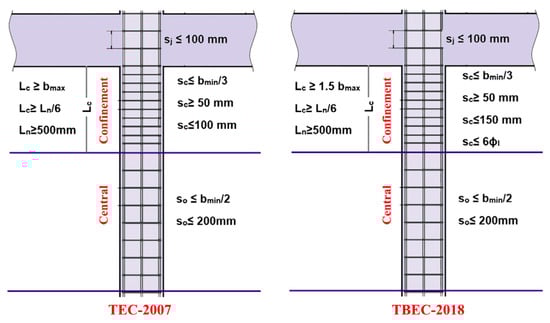 The requirements for transverse reinforcement in RC columns, as specified in the last two seismic design codes used in Türkiye, are illustrated in Figure 16.