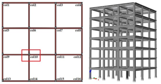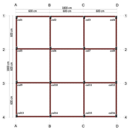 The selected RC structure model has three spans in each direction, with each span chosen to be 6 m. The floor plan of the RC structure model and the representation of the columns are shown in Figure 17.