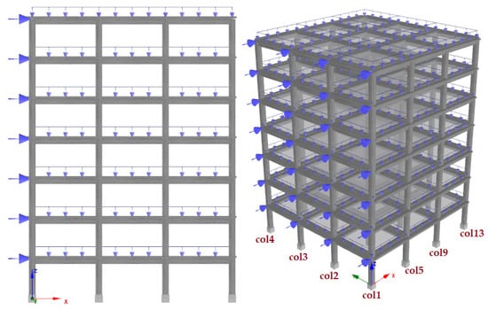 In RC structures, structural analyses were conducted by varying key factors affecting the inadequate shear capacity in columns, such as concrete strength and the spacing of transverse reinforcement. SeismoStruct-2024 [] software was used for the numerical analyses. Pushover analysis was employed in these numerical analyses. Structural nonlinear behavior due to earthquakes can be assessed using either nonlinear time history analysis or static pushover analysis. The pushover analysis method determines structural nonlinear responses through a series of linear operations, enabling the development of a structural capacity curve. This approach effectively tracks the damage states of a structure at each step, illustrating how deterioration progresses from minor damage to complete failure.
