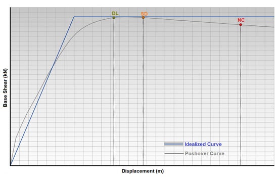 Pushover analysis was used in all structural models. Pushover analysis, a numerical technique, investigates the extent of deformation and the behavior of structures or structural elements under a specific load. This type of analysis typically considers both elastic and plastic responses. Pushover analysis is widely employed in earthquake engineering to predict how a structure will respond during seismic events. The method evaluates the deformation of a structure subjected to static loads (usually simulating ground motion) and identifies the point at which damage may occur. It is less complex and faster to perform than more advanced dynamic analyses. This approach enables the assessment of displacement, rotation, and potential damage locations within the structure [,,,]. Uniform load distributions were taken into account in all structural analyses. For the models considered in this study, the period, base shear force, as well as the elastic and effective stiffness values, were first obtained. Additionally, the target displacements specified in Eurocode-8 [] which are commonly used worldwide, namely damage limitation (DL), significant damage (SD), and near collapse (NC), were separately determined. The target displacements taken into consideration are shown in Figure 20. All target displacements for structural models are presented in the Table 3.
