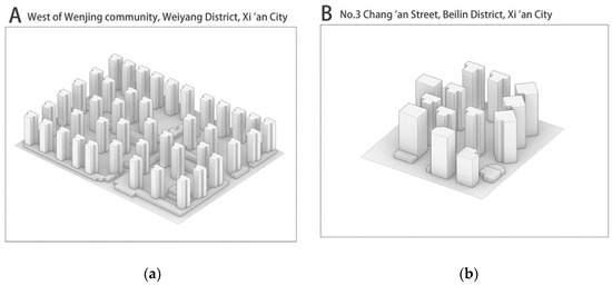 Figure 3. Building mass models of two cases. (a) Geometric model of CASE A; (b) geometric model of CASE B.